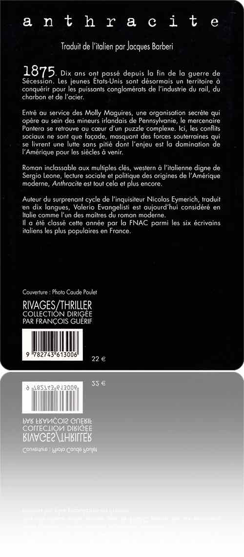 Valerio EvangelistiAnthracitedans l'édition : Payot & Rivages › Thriller, 2004[ 1 ] [ 2 ]de :Valerio Evangelistititre :Anthracitesous une couverture de :Claude Pouletédition :France › Paris : Payot & Rivages › Thrillertype, date et codification :volume simple, septembre 2004 (août 2004), ISBN 2-7436-1300-9description matérielle :336 pages, broché, 15×23 cmpar ailleurs :amazon.frbnf.frbooks.google.frpayot-rivages.netnotice :frxliijfpm96PpTHgJm0w5OwlK4WL5LBVcontenutextes : 1fiction : 1rédactionnel : 0francophone : 0traduit : 15‑329 → Valerio Evangelisti : Anthracite (2003 ↬ 2004)