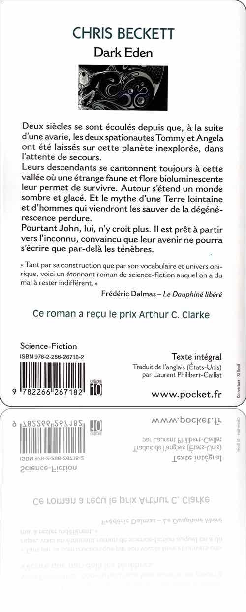 Chris BeckettDark Edendans l'édition : Univers poche/Pocket › Science-Fiction, nº 7212, 2016[ 1 ] [ 2 ]de :Chris Becketttitre :Dark Edensous une couverture de :Si Scottédition :France › Paris : Univers poche/Pocket › Science-Fiction, nº 7212type, date et codification :volume simple, avril 2016 (mars 2016), ISBN 978-2-266-26718-2description matérielle :512 pages, broché, 11×18 cmpar ailleurs :amazon.frpocket.frnotice :frxliiaafTFBsdtmPTDMhgH8EawycXLd4contenutextes : 1fiction : 1rédactionnel : 0francophone : 0traduit : 15‑509 → Chris Beckett : Dark Eden (2012 ↬ 2015)