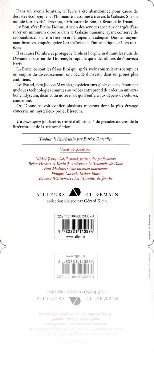 L.E. ModesittElyseumdans l'édition : Robert Laffont › Ailleurs et demain, 2008[ 1 ] [ 2 ]de :L.E. Modesitttitre :Elyseumsous une couverture de :Jackie Paternosterédition :France › Paris : Robert Laffont › Ailleurs et demaintype, date et codification :volume simple, septembre 2008 (août 2008), ISBN 978-2-221-11087-4description matérielle :408 pages, broché, 14×22 cmpar ailleurs :amazon.frbooks.google.frnoosfere.orgnotice :frxliiqOroo0AbdD0NtHAhNCKOs5ToXlwcontenutextes : 1fiction : 1rédactionnel : 0francophone : 0traduit : 15‑399 → L.E. Modesitt, Jr. : Elyseum (2007 ↬ 2008)