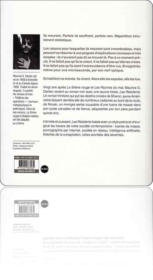 Maurice G. Dantecles Résidentsdans l'édition : inculte, 2014[ 1 ] [ 2 ]de :Maurice G. Dantectitre :les Résidentssous une couverture de :Rémi Pépinédition :France › Paris : inculte › [sans collection]type, date et codification :volume simple, juillet 2014, ISBN 979-10-91887-98-4description matérielle :656 pages, broché, 16×20 cmpar ailleurs :amazon.frbooks.google.frinculte.frnoosfere.orgnotice :frxliiclQViJonNfaVfyg0og7Hj7K0j9Gcontenutextes : 1fiction : 1rédactionnel : 0francophone : 1traduit : 03‑652 → Maurice G. Dantec : les Résidents (2014 [2013])