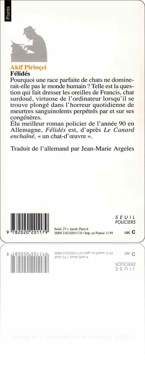 Akif PirinçciFélidésdans l'édition : le Seuil › Points › Roman › Policiers, nº R694, 1994[ 1 ] [ 2 ]de :Akif Pirinçcititre :Félidéssous une couverture de :Denis Hochédition :France › Paris : le Seuil › Points › Roman › Policiers, nº R694type, date et codification :volume commenté, novembre 1994, ISBN 2-02-020117-8description matérielle :320 pages, broché, 11×18 cmpar ailleurs :amazon.frbnf.frbooks.google.frnotice :frxliiaWOVu1FeOI5CYFewvs3yh4sgkyicontenutextes : 1fiction : 1rédactionnel : 0francophone : 0traduit : 13‑296 → Akif Pirinçci : Félidés (1989 ↬ 1992)