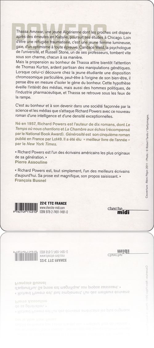 Richard PowersGénérositédans l'édition : le cherche midi › Lot 49, 2011[ 1 ] [ 2 ]de :Richard Powerstitre :Générositésous une couverture de :Robert Tardioédition :France › Paris : le cherche midi › Lot 49type, date et codification :volume simple, février 2011, ISBN 978-2-7491-1491-0description matérielle :472 pages, broché, 14×21 cmpar ailleurs :amazon.frbnf.frbooks.google.frcherche-midi.comnotice :frxliicbb283YKbS4lfxGSsdht8nGuGracontenutextes : 1fiction : 1rédactionnel : 0francophone : 0traduit : 15‑472 → Richard Powers : Générosité : un perfectionnement (2009 ↬ 2011)