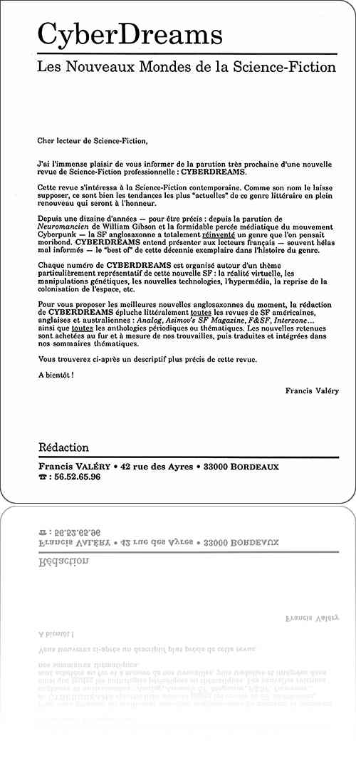 Dix livraisons en tout, numérotées 01 (les Mondes virtuels), 02 (Banlieues stellaires), 03 (Futurs au quotidien), 04 (Génies génétiques), 05 (Musiciens de demain), 06 (Univers en folie), 07 (Rencontres cosmiques), 08 (les Mondes d'à côté), 09 (Société sens dessus-dessous) & 10 (Amours virtuelles). Le catalogue 1996-97 de l'éditeur a annoncé un numéro 08 (Avenirs à vapeur) qui n'a jamais paru. Direction littéraire (nouvelles anglo-saxonnes) pour les numéros 01 à 03 : Sylvie Denis & Francis Valéry ; direction littéraire pour le numéro 04 : Sylvie Denis & Francis Valéry ; directrice littéraire pour les numéros 05 à 10 : Sylvie Denis. Se transforme en CyberDreams › l'antho de poche en août 1997, sous l'unique direction de Sylvie Denis. Voir aussi CyberDreams › le supplément gratuit réservé aux abonnés. L'ISSN 1264-1324 porté par les huit derniers numéros de ce périodique correspond en fait à "CyberDreams" › la collection grand format. Seules les lettres au Courrier des lecteurs qui font autre chose que de s'exprimer incidemment sur la revue par elle-même ont été prises en compte ici.