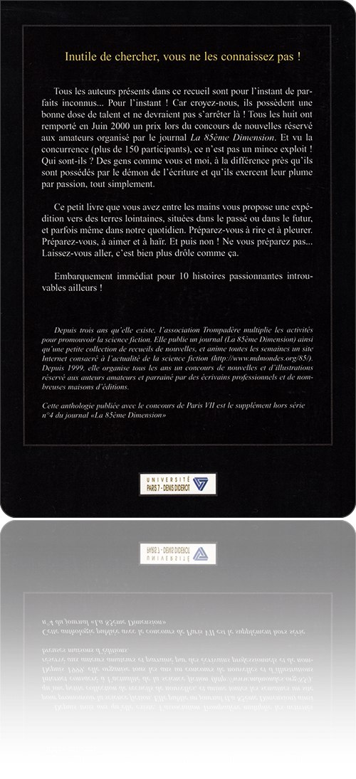Publié avec le concours de l'université Paris VII–Denis-Diderot. Comporte une préface de toute l'équipe du périodique la 85ème dimension qui a agi en tant qu'anthologiste. L'illustration de couverture, reprise en noir & blanc en tête de chaque texte, n'est pas créditée, dont on sait pourtant que son auteur a remporté avec elle en 2000 le Concours de la 85ème dimension.