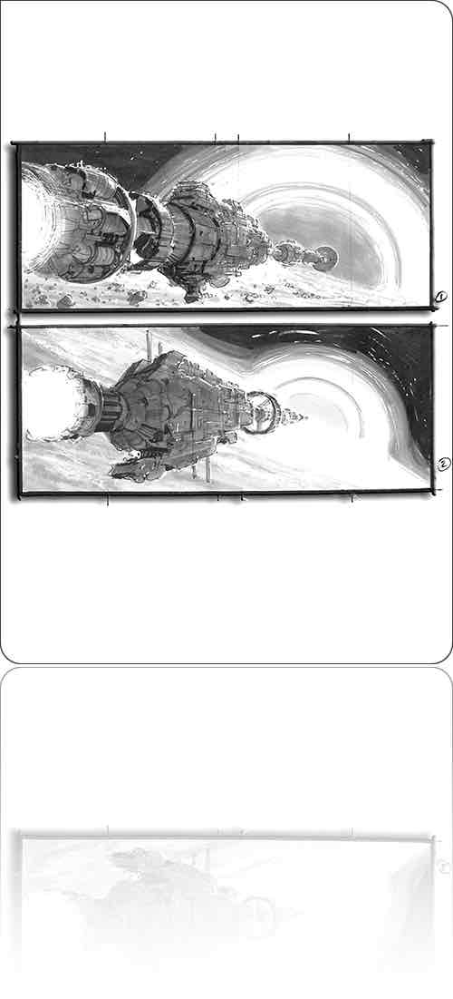 couverture dans les tons de jaune représentant un vaisseau spatial parmi les astéroïdes qui s'approche d'une singularité