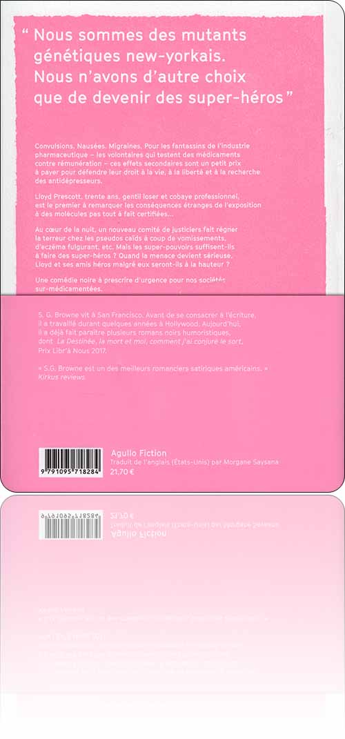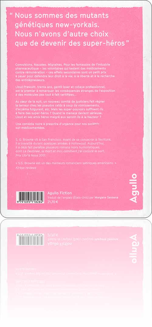 Conception graphique : WIPbrands. Comporte un après-propos et, sur le deuxième rabat de la bande, la devinette Hé, doc’, c'est quoi ce médoc ? listant en quelque sorte les effets secondaires de la ciprofloxacine.