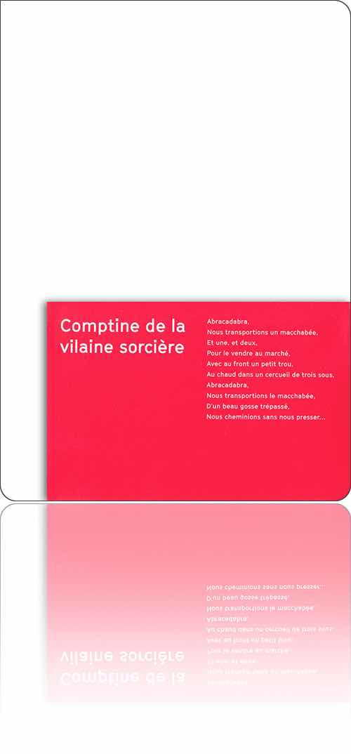 Conception graphique : WIPbrands. On retrouve la comptine de la vilaine sorcière sur le deuxième rabat de la bande.
