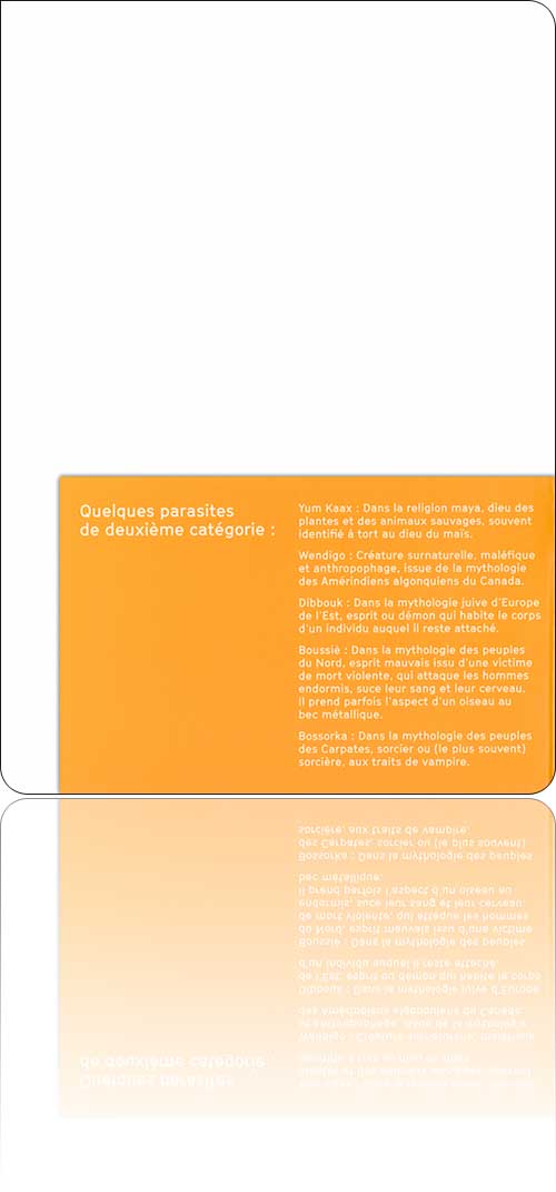 Conception graphique : WIPbrands. On retrouve la description de quelques parasites de deuxième catégorie sur le deuxième rabat de la bande.