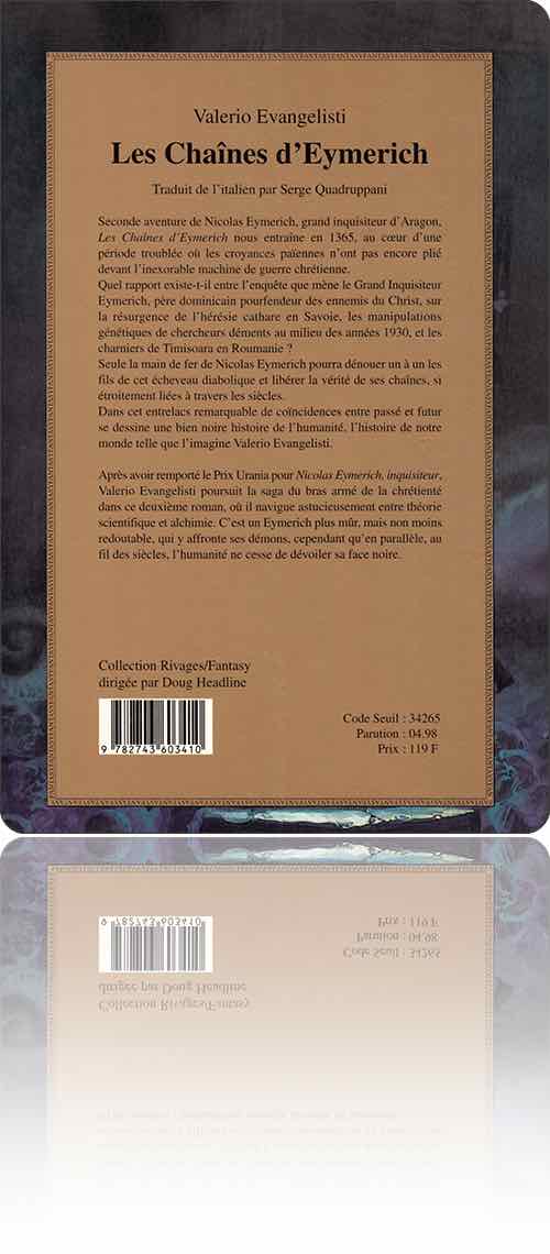 Dans le deuxième volume, les Chaînes d'Eymerich, de vastes passages sont consacrés à une crypto-histoire de notre époque, spécifiquement comment la RACHE a acquis les technologies abominables et soigneusement dissimulées qu'elle mettra en œuvre dans le futur. Un long chapitre est consacré à un épisode de la guerre entre RACHE et Euroforce.(3) Mais l'essentiel du livre est une enquête menée par Eymerich au Val d'Aoste,(4) où il doit pourchasser des successeurs des Cathares. À la fin des années 1360, c'est surprenant — on comprend vite qu'une forme d'immortalité entre en jeu. Et cette fois-ci, l'argument fantastique (ou pseudo-scientifique, puisqu'il s'agit de pharmacopée déviante plus que de surnaturel) donne lieu à une enquête bourrée de rebondissement : les Cathares sont des hérétiques hauts en couleurs, les monstruosités impressionnantes à souhaits, les retournements dus à la ruse d'Eymerich époustouflants comme jamais. Bref, du point de vue de la littérature populaire à l'état pur, c'est le meilleur roman de la série, sans renoncer à l'érudition historique ou aux points de vue politiques.
