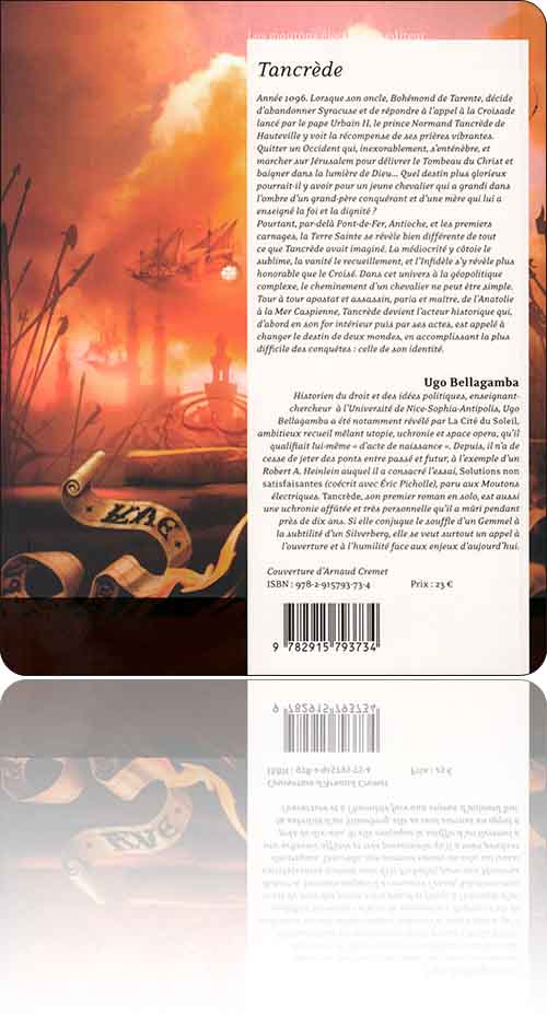 Ce qui est le dilemme de ce livre : dans le dossier qui le suit, Ugo Bellagamba donne un aperçu émouvant de ses motivations personnelles, et se place dans la déjà longue tradition des œuvres de fiction qui ont chacune réécrit le personnage de Tancrède.(2) Le sien, comme tous ceux qui l'ont précédé, comme le chevalier Timour dessiné par Sirius, promène ostensiblement son identité de son époque à la nôtre, et tant pis si on perd une partie de ce qui fait le sel de l'uchronie ou du roman historique.