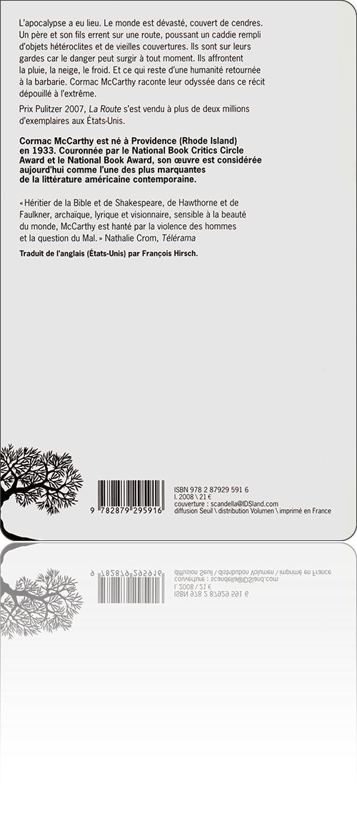 Non, ce pays n'est pas pour le vieil homme n'est pas exactement une œuvre très guillerette, mais comparé à ce nouveau livre de Cormac McCarthy, on dirait Oui-Oui au Pays des Jouets. Un futur non spécifié, mais qui ne peut pas être bien lointain. La Terre a dû connaître un hiver nucléaire : il y a des villes entières qui ont brûlé, le soleil ne se montre plus jamais, les États-Unis sont couverts de neige, et toute la végétation, sans exception, est morte. Conséquence : plus un animal vivant, et plus beaucoup d'humains, non plus. Les quelques-uns qui restent sont occupés à racler les dernières miettes de stocks alimentaires qu'ils peuvent trouver, et quand ils n'en trouvent pas, à se manger entre eux.