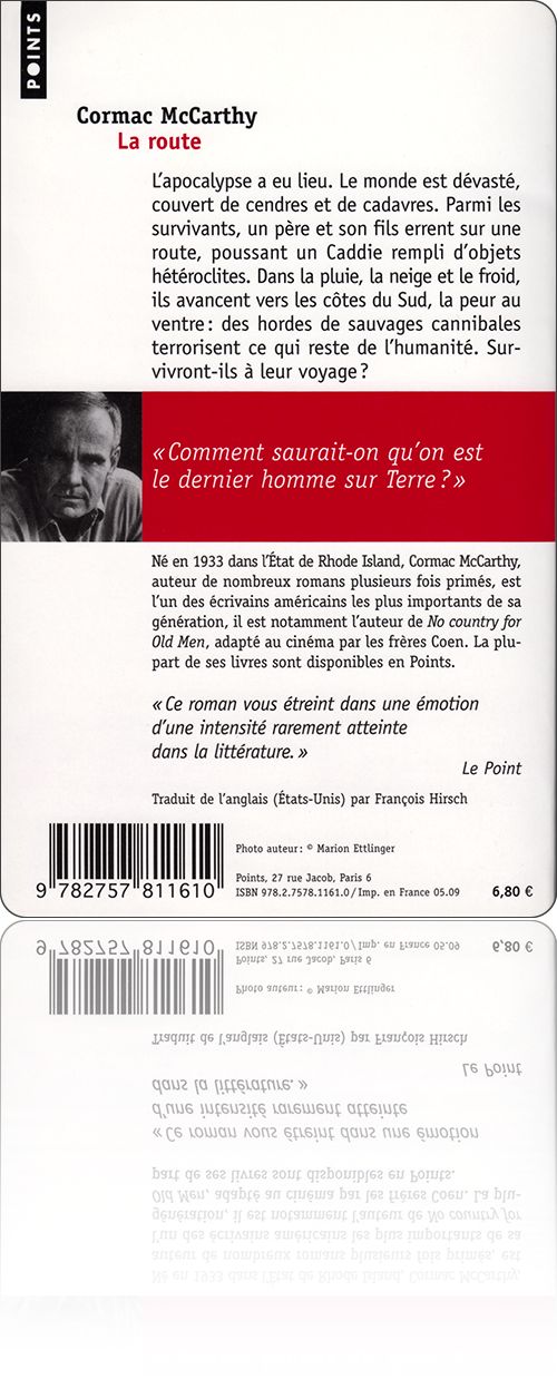 Pour revenir au roman lui-même, on se doit de souligner l'excellent travail du traducteur François Hirsch, lequel a également officié sur Non, ce pays n'est pas pour le vieil homme,(1) autre chef-d'œuvre de Cormac McCarthy. En effet, Hirsch a osé conserver la forme, notamment l'absence de ponctuation et de chapitrage du romancier américain. Il n'a pas touché à la multiplicité de "et" si courante en anglo-américain, mais beaucoup moins usitée en français, langue qui offre une large palette d'équivalent à cette conjonction de coordination. Ce choix, rébarbatif au premier abord, a l'avantage de conserver l'atmosphère si particulière du texte original, qui colle fort bien à la thématique menaçante de la Route.