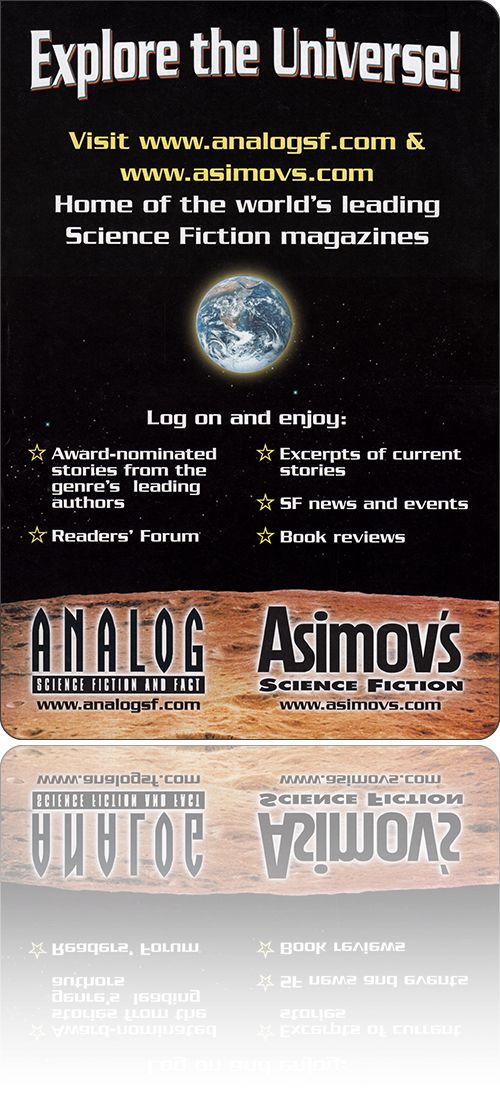 Je n'ai pas fini de faire le tour des rubriques mais, comme les autres revues américaines de SF, Asimov's n'en compte guère ; on trouvera dans ce numéro deux poèmes, une chronique de Robert Silverberg (qui prit il y a bien des années la succession d'Asimov lui-même), et un article sur les livres de Paul Di Filippo, qui se distingue par des choix de sujets originaux, et des avis pénétrants et très bien écrits.