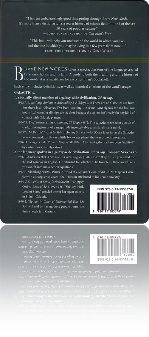 On y trouve, classés par ordre alphabétique, une foultitude de termes, d'aerocar à zero-g, en passant par bug-eyed monster, cyborg, dystopia, FTL (faster than light, bien sûr), humanoid, multiverse, neuronic, parallel universe, replicant, subspace, terraforming, j'en passe et des meilleurs. Chaque terme est suivi d'une définition, puis d'une série de citations dans l'ordre chronologique d'utilisation. Ainsi insectoid (adj.) est défini comme “insect-like” et suivi d'une citation tirée de Star maker (Créateur d'étoiles, 1937) d'Olaf Stapledon, puis de phrases tirées d'œuvres de Satterfield, Foster, Benford, Card et Jeter. La définition est parfois accompagnée d'explications plus détaillées ou de remarques.