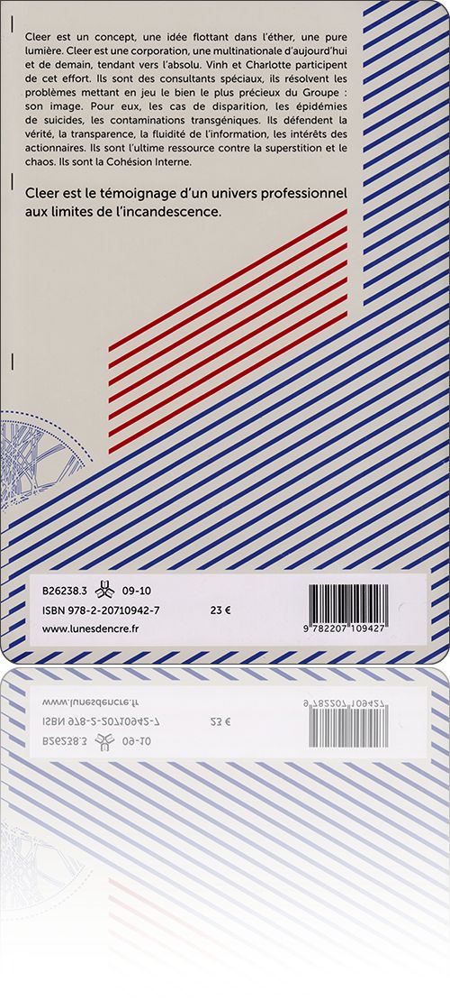Il me semble avoir, lors de ma chronique du remarquable roman de Catherine Dufour Outrage et rébellion, signalé l'indigence de la couverture de Daylon. Je récidive à propos de celle de ce CLEER. La collection parvenait à une certaine unité, au moins par le biais des couvertures dessinées, et en voilà une qui tire le livre vers l'anonymat. Du gris, des rayures bleues genre parking, un demi-cercle en fenêtre ouvrant sur un rouge strié de traits courbes façon rosace, pas de quoi tirer l'œil, même à plat sur une table, surtout au milieu des publications de littérature générale du moment — c'est là que je l'ai découvert dans un des magasins de Joseph G. Autre handicap : le titre et le sous-titre. Même la quatrième de couverture ne parvient pas à nous donner une idée claire de ce CLEER : une idée, un concept, une multinationale, une pure lumière‥? Le sous-titre mélange, pour moi, deux mots de français et un terme qui me renvoie à l'anglais ; comme chante mon camarade Bobby Lapointe : « Comprend qui peut, comprend qui veut. »