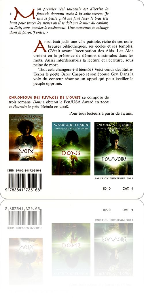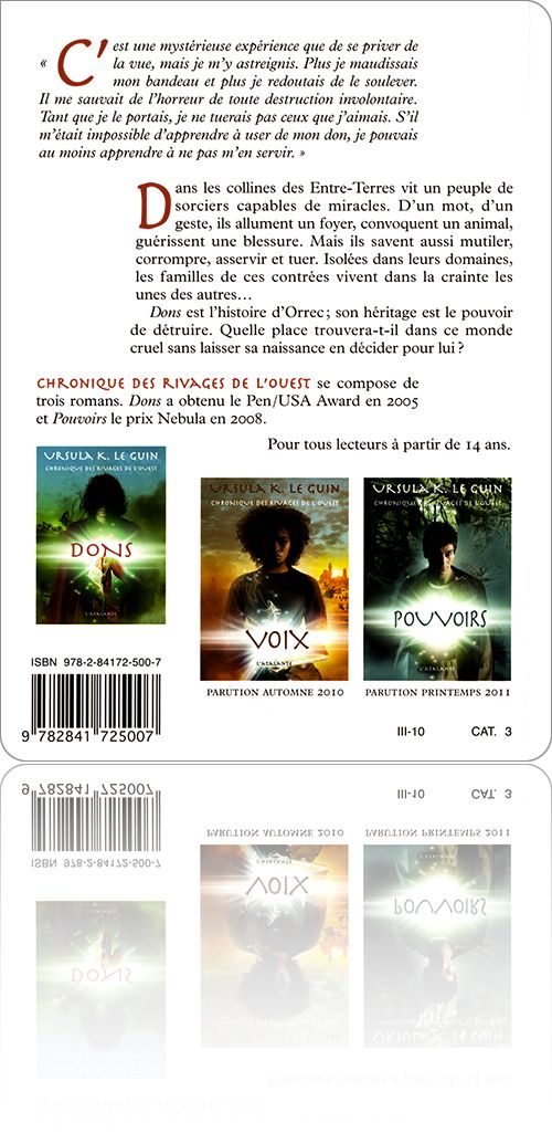 En quatrième de couverture, on trouve la mention « Pour tous lecteurs à partir de 14 ans. », et il est dommage de devoir attendre le printemps 2011 pour lire Pouvoirs, la suite et la fin ; on aurait bien aimé retrouver les trois titres avec emboîtage pour Noël. Cette trilogie constitue une œuvre insidieusement édifiante ou didactique pour bon lecteur (aimant lire) : un bon cadeau en perspective.