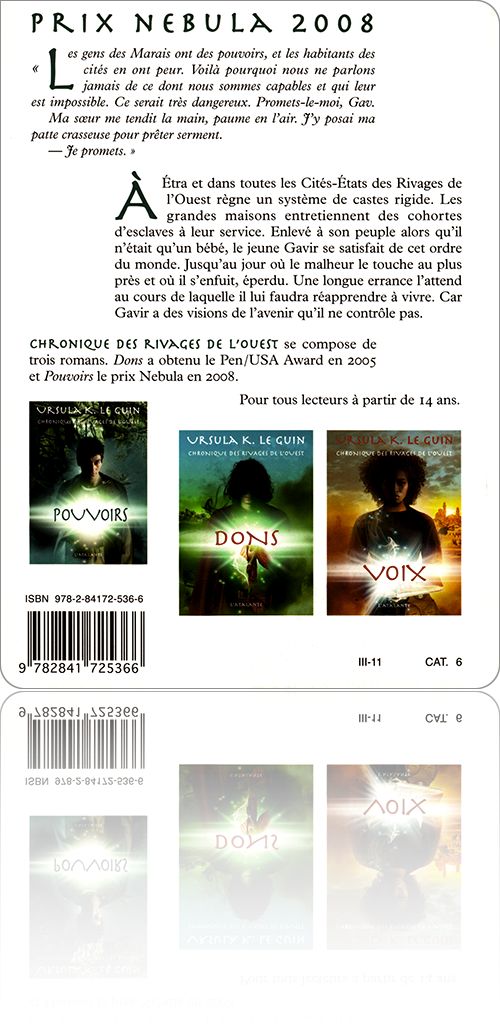 Ce roman a obtenu le prix Nebula et bien entendu il fait la preuve, si besoin était, du talent d'Ursula K. Le Guin. Comme les deux autres titres de cette chronique, Dons et Voix, il met en scène des jeunes confrontés d'une part à leur “pouvoir” et d'autre part à la société qui les entoure ou qui les accueille. Le héros ici s'appelle Gavir ; il vit dans une des Cités-États des Rivages de l'Ouest, a été enlevé très jeune à son peuple d'origine, et, s'il vit et joue avec les enfants du Seigneur, il demeure un “esclave”. Il ne peut échapper à son sort mais il a des visions (de l'avenir).