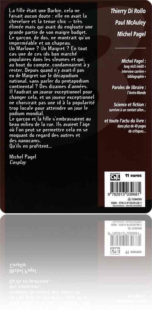 Naturellement, nous avons droit à une nouvelle de Pagel, "Cosplay". De la SF, ce qui est devenu inhabituel pour lui ; qui rend quand même hommage à la fiction populaire, on s'y retrouve. Dans un monde futur très contrôlé, la vie des masses prolétaires est rythmée par les compétitions de héros : les individus assez ambitieux, et assez téméraires, adoptent le costume, le comportement, et peu à peu les caractéristiques corporelles, d'une “id”, tirée d'une des figures de la culture populaire. De Mickey à Barbie en passant par Zorro et Tintin… Des compétitions à tous les niveaux permettent aux vainqueurs (les meilleurs dans chacune des id qui ont à ce moment la faveur du public) de siéger dans des conseils de la circonscription concernée. Tout est truqué, vous vous en doutez bien, et l'intrigue relativement ordinaire — avec toutefois une conclusion inhabituelle. Bien trouvé, et prenant. On observera toutefois que les id choisies par Pagel trahissent son âge ; celles qui marcheraient aujourd'hui seraient bien différentes, issues de l'univers du jeu informatique au moins autant que de celui du récit (qu'il soit roman, BD, ou série TV). Sans parler du futur… dans lequel on peut, certes, postuler tous les retours, spin offs et revivals que l'on souhaite.