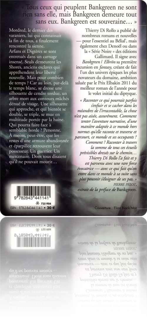 Monde-univers, Bankgreen n'a décidément pas encore livré tous ses secrets. Aussi, après un premier roman et une nouvelle,(1) Thierry Di Rollo invite-t-il tout naturellement ses lecteurs à une nouvelle visite de cette planète à la mythologie touffue. On retrouve bien évidemment toute la poésie des mots et le rythme si particulier imposé par l'auteur avec un découpage nerveux en chapitres parfois très courts. Poursuivant la narration initiée dans Bankgreen, Di Rollo fait ainsi revenir d'entre les morts le personnage emblématique qu'est Mordred, le dernier des Varaniers. Par le biais de flashbacks, il dévoile quelques secrets sur les origines de cette créature aussi mystérieuse que complexe pour qui la mort est sa raison de vivre, si tant est qu'un être caché au cœur d'une armure puisse être qualifié de vivant. S'il sait présenter ce personnage de manière particulièrement intéressante, surtout dans son rapport avec la mort, Di Rollo ne cherche nullement à le rendre sympathique mais fait de lui le point central de son récit et le point d'équilibre de son monde mauve et noir. L'un des meilleurs portraits de Mordred est sans doute celui fait par Dyan, le grand rat noir. En effet, ce dernier le décrit comme un être qui écume Bankgreen, semant la mort sur son chemin en prétextant une fin atroce à ceux qu'il croise pour justifier le couperet de sa lame.