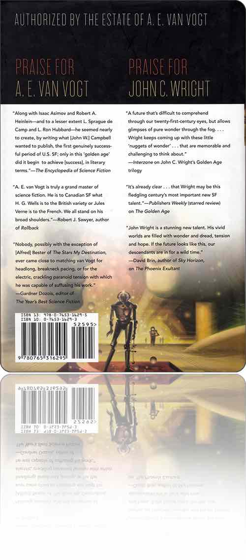 Ce n'est pas la première fois qu'un jeune et brillant auteur prolonge une série-phare de l'âge d'or de la SF : Greg Bear, Gregory Benford ou David Brin l'ont fait par exemple pour Fondation, ou Stephen Baxter pour Arthur C. Clarke. Mais ceux-là venaient se placer sous l'enseigne d'auteurs devenus des marques aussi connues que lucratives. Je doute fort que Van Vogt bénéficie d'un tel statut, surtout dans sa langue d'origine. Wright, sans doute, a agi par désir de rendre hommage à un écrivain qui l'a marqué dans sa jeunesse — et peut-être de se mesurer à lui dans une bataille d'imaginations échevelées.