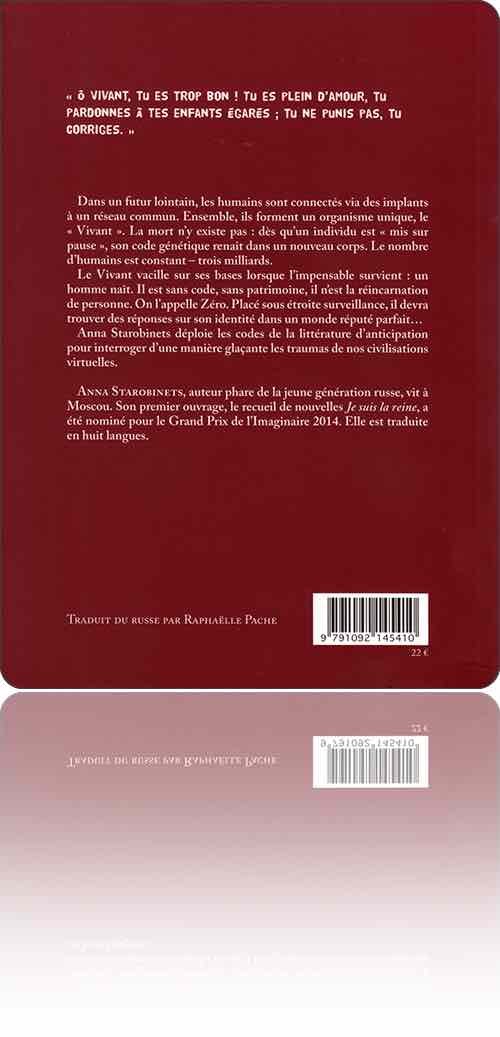Pour cette nouvelle expédition en terre étrangère, Mirobole nous invite à retrouver la romancière russe Anna Starobinets. À travers son recueil Je suis la reine et autres histoires inquiétantes (2005), on avait pu découvrir ses univers fantastiques, variations parfois effrayantes et toujours troublantes du quotidien. Avec le Vivant, c'est un monde possible, mais futur, et tout aussi angoissant qu'elle nous fait visiter. Les thématiques abordées dans ce roman sont, somme toute, plutôt classiques. On y retrouve ainsi une société parfaitement organisée qui ne vise que le bonheur de ses membres en limitant leur liberté, leur nombre et leur durée de vie à la manière de la cité idéale de Quand ton cristal mourra de William F. Nolan et George C. Johnson (1967). Les habitants du monde du Vivant sont également soumis à une surveillance et à une propagande dignes de la Grande-Bretagne parfaite imaginée par George Orwell dans 1984 (1949). Si Anna Starobinets reprend à son compte quelques-unes des idées fortes de ces deux romans, elle les actualise en créant son propre univers avec des règles strictes. Ainsi, il ne peut y avoir que trois milliards d'individus qui vivent connectés, se reproduisent et sont “mis en pause” pour que leur code génétique puisse renaître dans un nouveau corps. Des règles qu'elle détourne immédiatement en y intégrant cet élément inconnu et incontrôlable qu'est le personnage de Zéro.