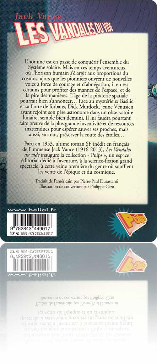 Une belle couverture tireuse d'œil pour ce premier volume de la nouvelle collection "Pulps" dont le nom rend hommage aux magazines bon marché imprimés sur du mauvais papier qui permirent aux grands noms de la Science-Fiction américaine de faire leurs preuves. Et un premier titre qui va attrister les fans de Jack Vance : il ne restera plus d'inédit du maître en français. Seul ce roman de 1953 manquait encore à l'appel. Les mauvaises langues diront peut-être que s'il était resté dans l'ombre c'est qu'il y avait une raison. Les amateurs se précipiteront. Et auront plaisir à lire un roman conscient de ses limites qui ne se fait aucune illusion. On se demandera cependant si la qualité de la traduction de Pierre-Paul Durastanti ne valorise pas cette œuvre un peu oubliée.