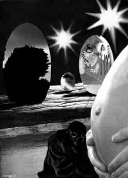 « La mission fondamentale de l'œuf d'Elduo ne consiste-t-elle pas à démontrer la suprématie de la période d'incubation sur toutes formes de vie, jugées secondaires ? » s'interrogea le conseiller culturel de la Régence au cours d'une célèbre émission holovisée. « Remarquez, de surcroît, que le liquide amniotique ne subit aucune altération malgré les dangereux régimes auquel on le soumet » ajouta-t-il pour appuyer le caractère absurde et illogique de sa conclusion.